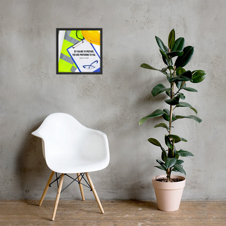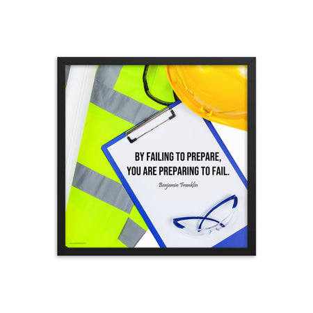 This safety poster depicts a clipboard surrounded by various PPE like a hard hat and safety glasses, emphasizing the importance of preparation. Accompanying the image is a powerful quote from Ben Franklin, reminding us, "By failing to prepare, you are preparing to fail."