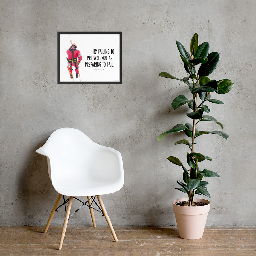 This safety poster depicts a person fully equipped in fall protection gear, emphasizing the importance of preparation. Accompanying the image is a powerful quote from Ben Franklin, reminding us, "By failing to prepare, you are preparing to fail."
