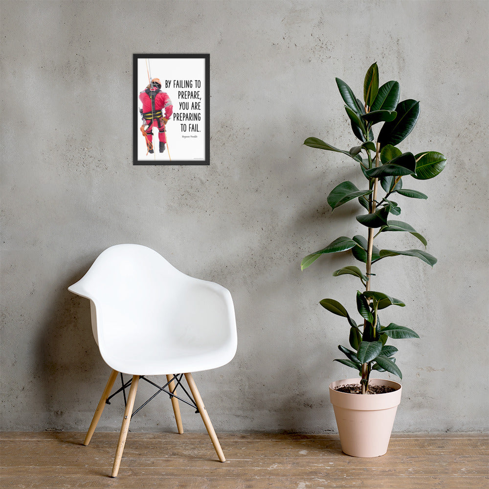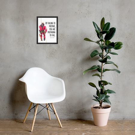 This safety poster depicts a person fully equipped in fall protection gear, emphasizing the importance of preparation. Accompanying the image is a powerful quote from Ben Franklin, reminding us, "By failing to prepare, you are preparing to fail."