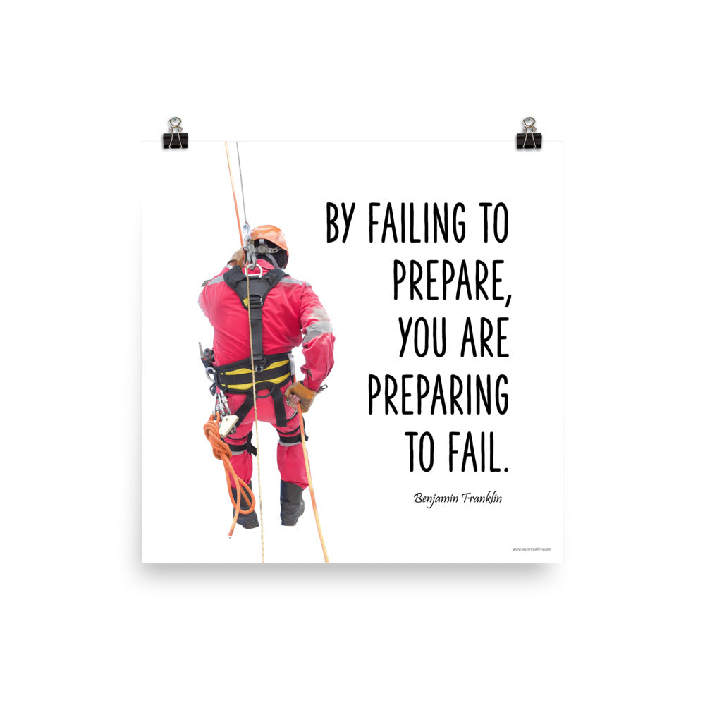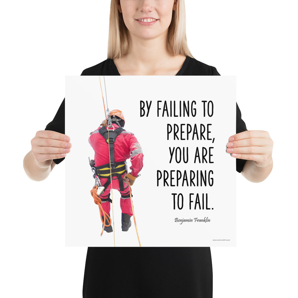 This safety poster depicts a person fully equipped in fall protection gear, emphasizing the importance of preparation. Accompanying the image is a powerful quote from Ben Franklin, reminding us, "By failing to prepare, you are preparing to fail."