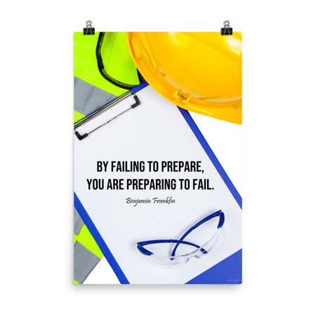 This safety poster depicts a clipboard surrounded by various PPE like a hard hat and safety glasses, emphasizing the importance of preparation. Accompanying the image is a powerful quote from Ben Franklin, reminding us, "By failing to prepare, you are preparing to fail."