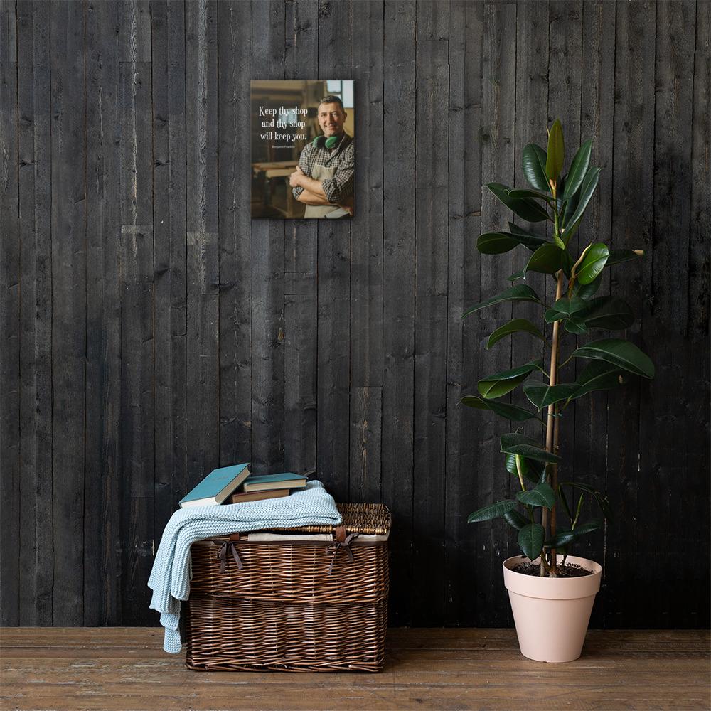 The inspiration for this piece hails from the timeless wisdom of Benjamin Franklin, who understood the simple yet profound relationship between a craftsman and his workspace. The cheerful woodworker, bathed in warm, natural light, mirrors the well-kept, organized shop around him, embodying the truth that when we take care of our workplaces, they take care of us in return. This philosophy extends not just to the physical condition of the shop, but also to the practices employed within it—prioritizing safety, organization, and respect for every tool and material therein.
