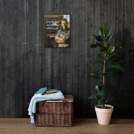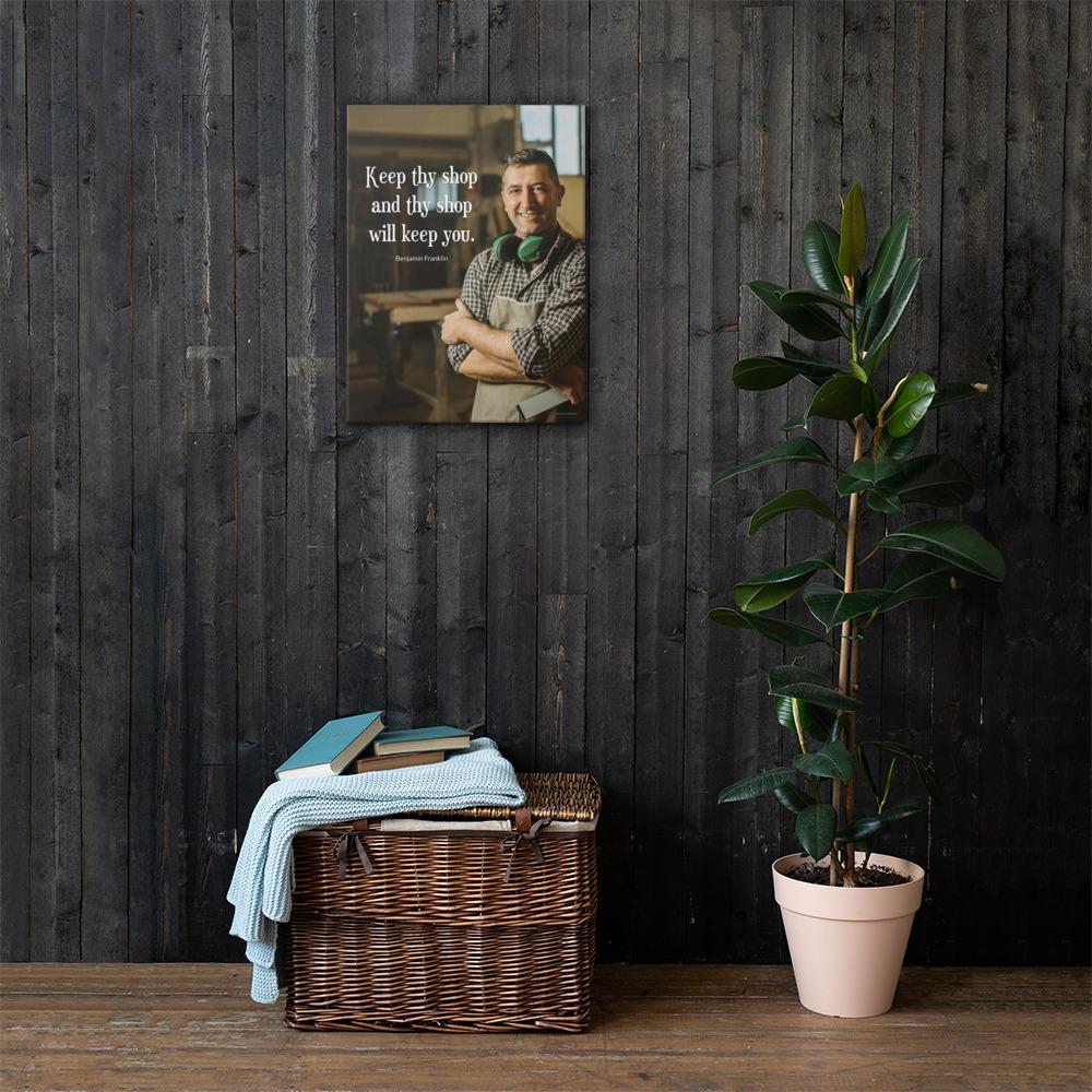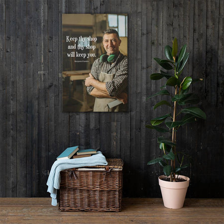 Introducing our safety poster, designed to uplift and enlighten the atmosphere of any workplace, especially those in the skilled trades and crafts. The visually striking poster features a content woodworker, donning a neat apron and casually resting his earmuffs around his neck. Alongside this reassuring image is an enduring quote from Benjamin Franklin, "Keep thy shop and thy shop will keep you," reminding each individual of the reciprocal relationship between diligent work practices and a sustaining, safe workshop.