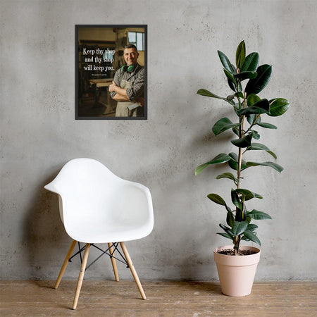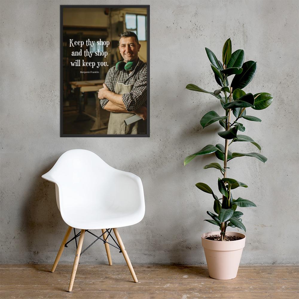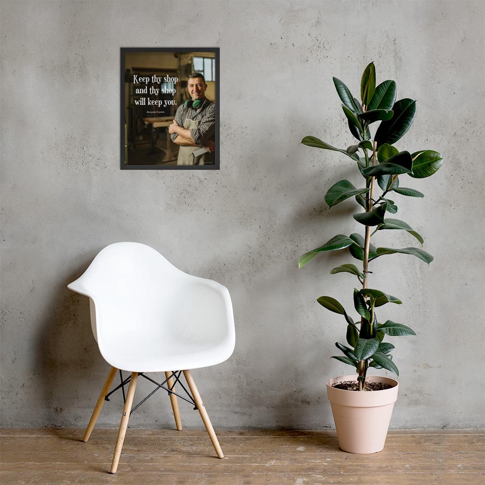 Introducing our safety poster, designed to uplift and enlighten the atmosphere of any workplace, especially those in the skilled trades and crafts. The visually striking poster features a content woodworker, donning a neat apron and casually resting his earmuffs around his neck. Alongside this reassuring image is an enduring quote from Benjamin Franklin, "Keep thy shop and thy shop will keep you," reminding each individual of the reciprocal relationship between diligent work practices and a sustaining, safe workshop.