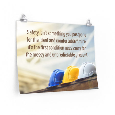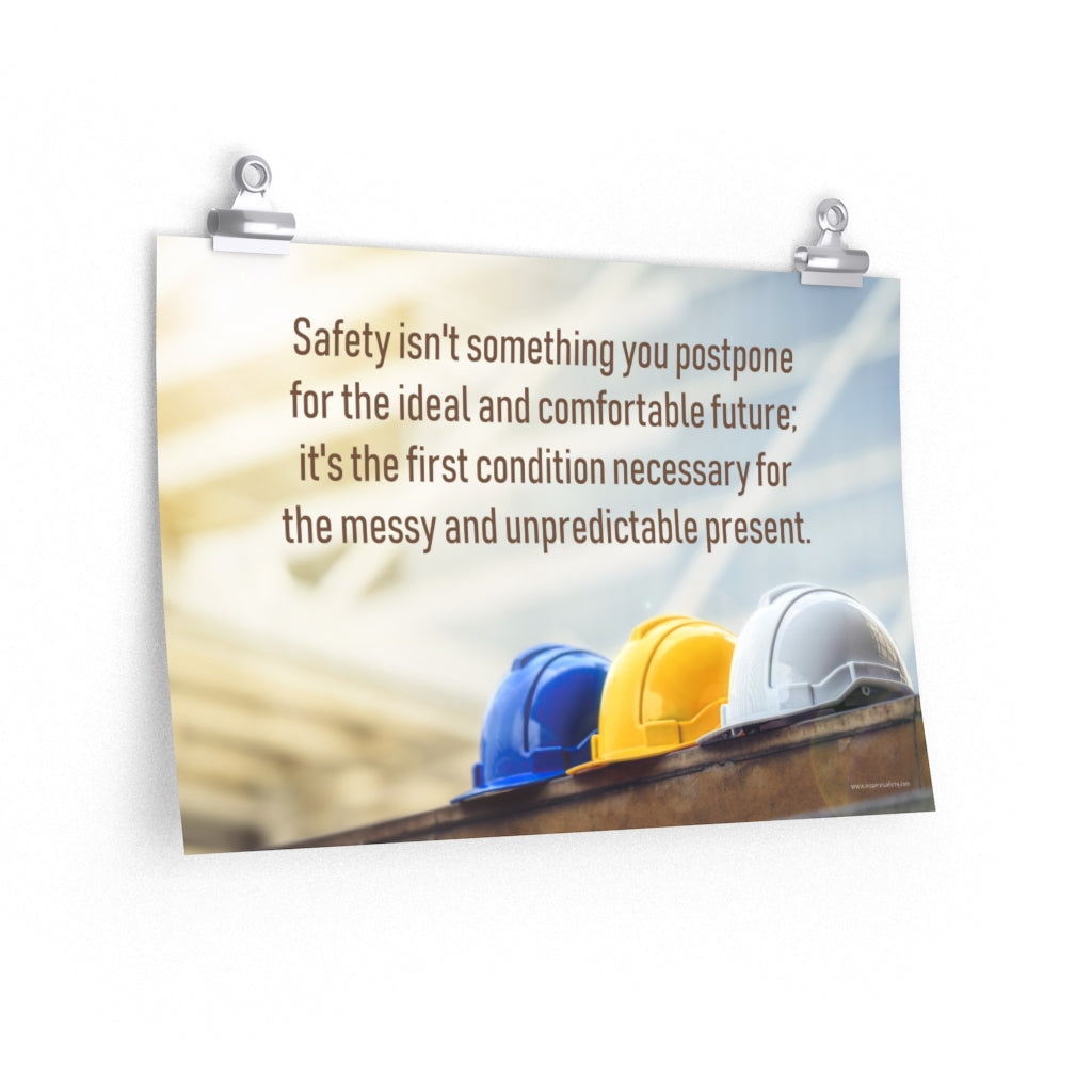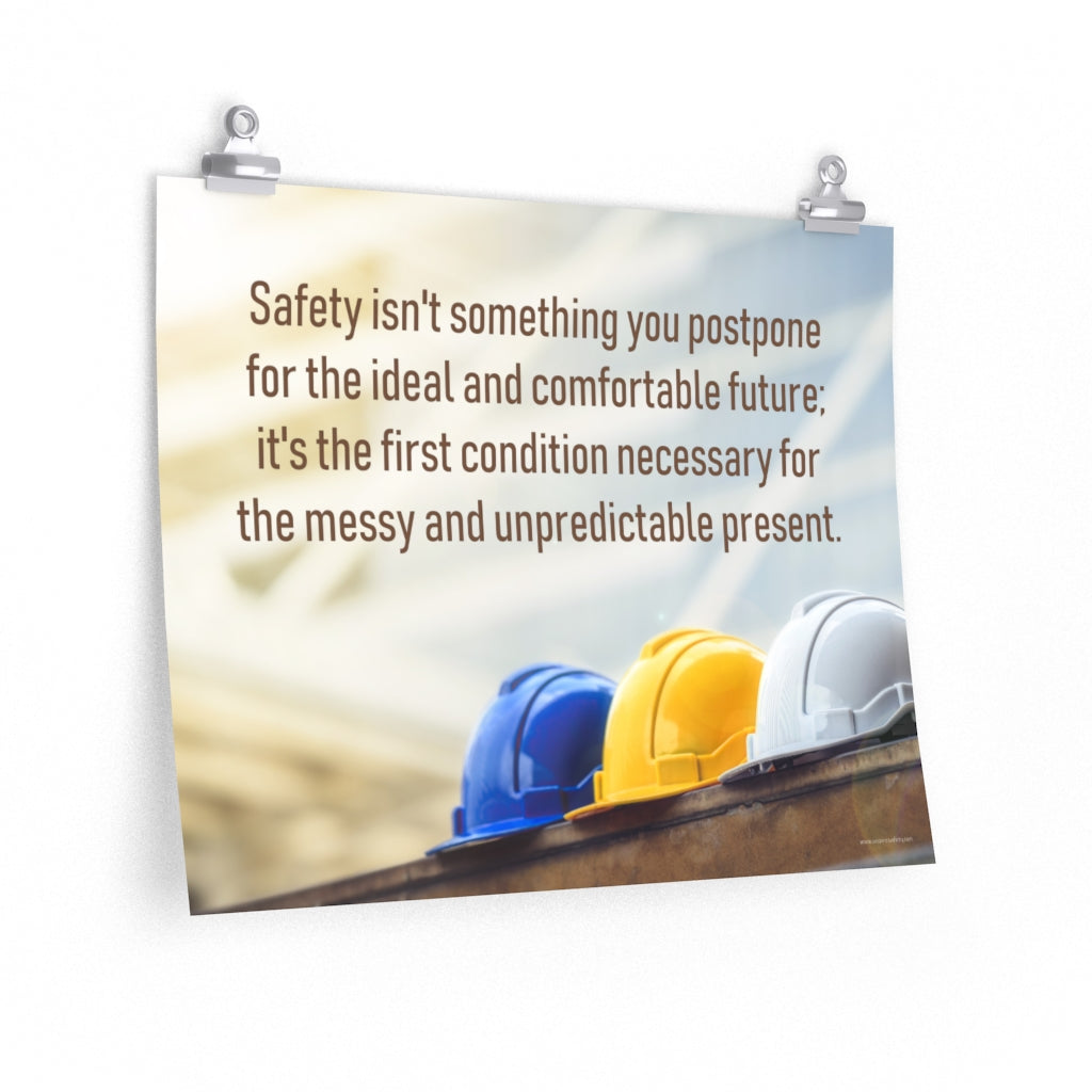 A workplace safety poster showcasing three vibrant hard hats resting on a wall, accompanied by the slogan "Safety isn't something you postpone for the ideal and comfortable future. It's the first condition necessary for the messy and unpredictable present."