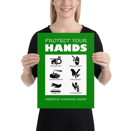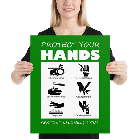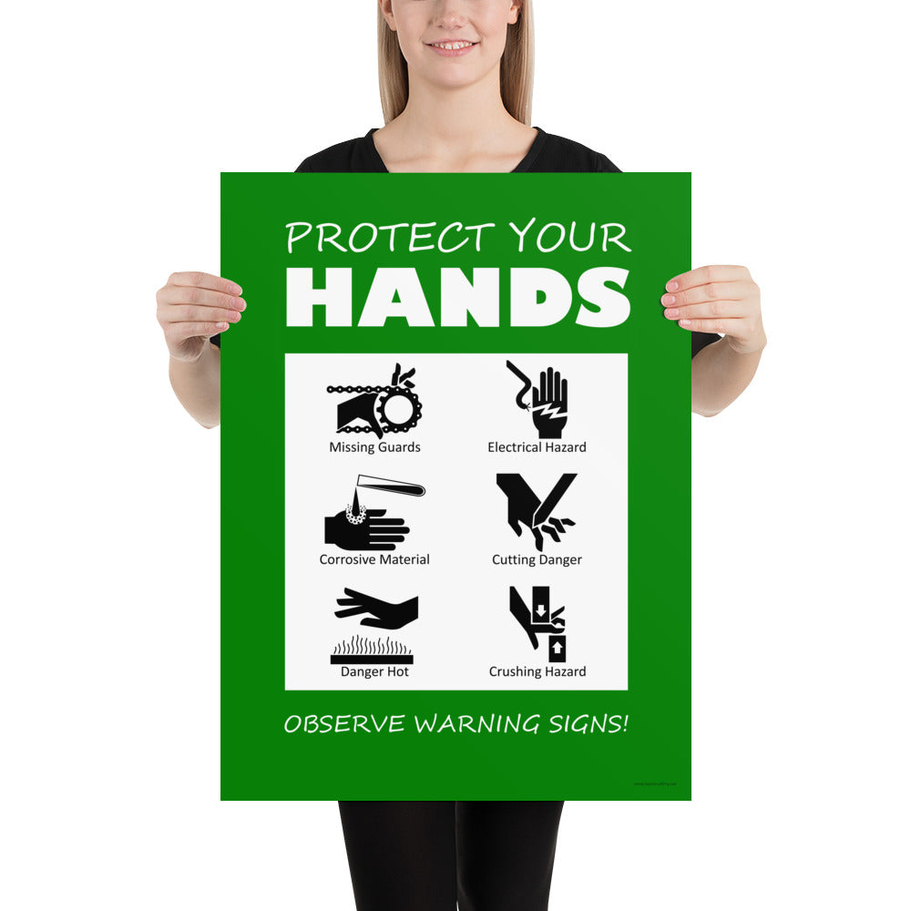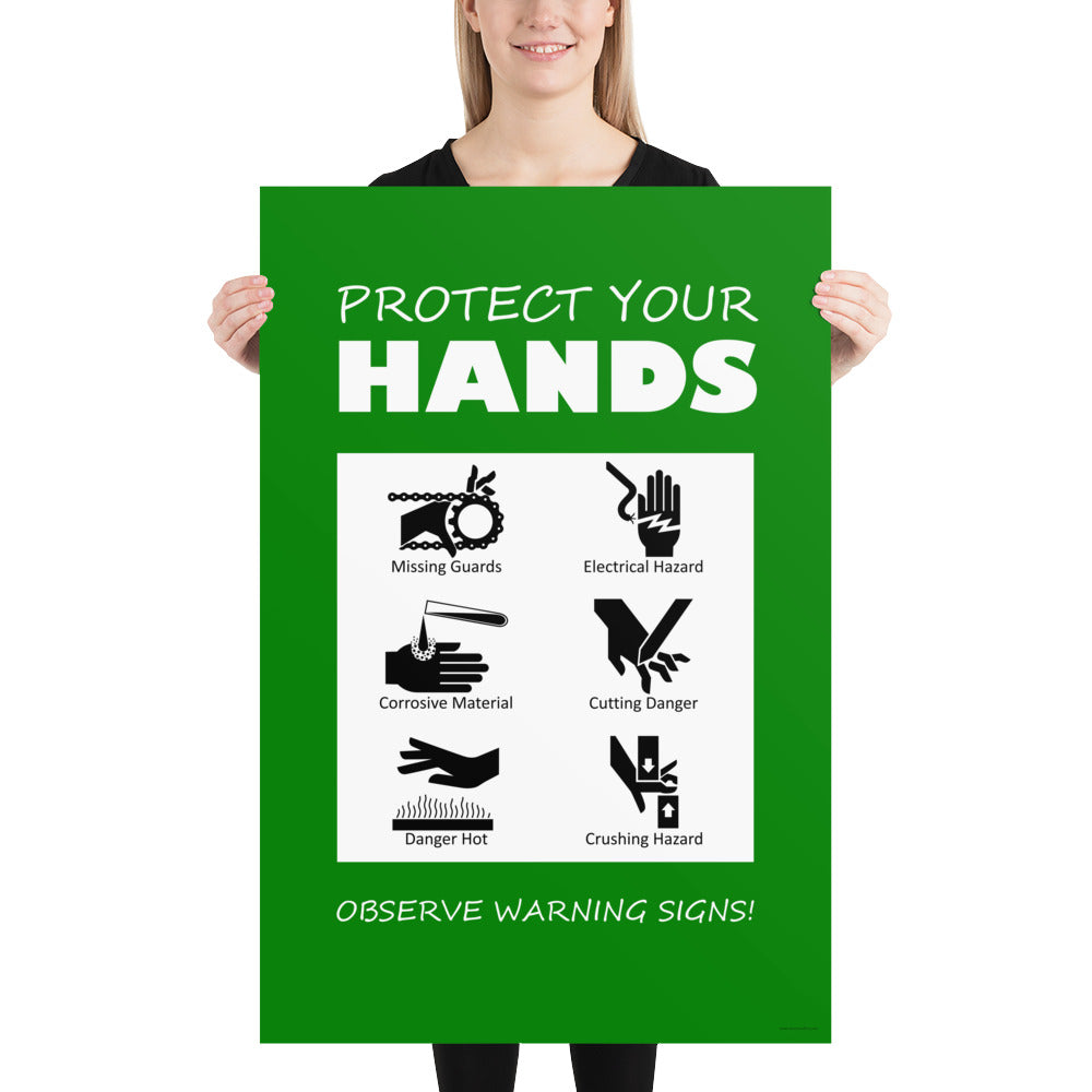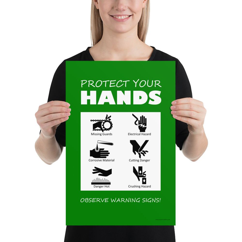 This workplace safety poster, presented in striking green with bold white text, serves as a stark reminder: "Protect your hands, observe warning signs". Accompanied by six impactful diagrams illustrating potential hand injuries, it's a powerful tool designed to foster a conscious safety culture.