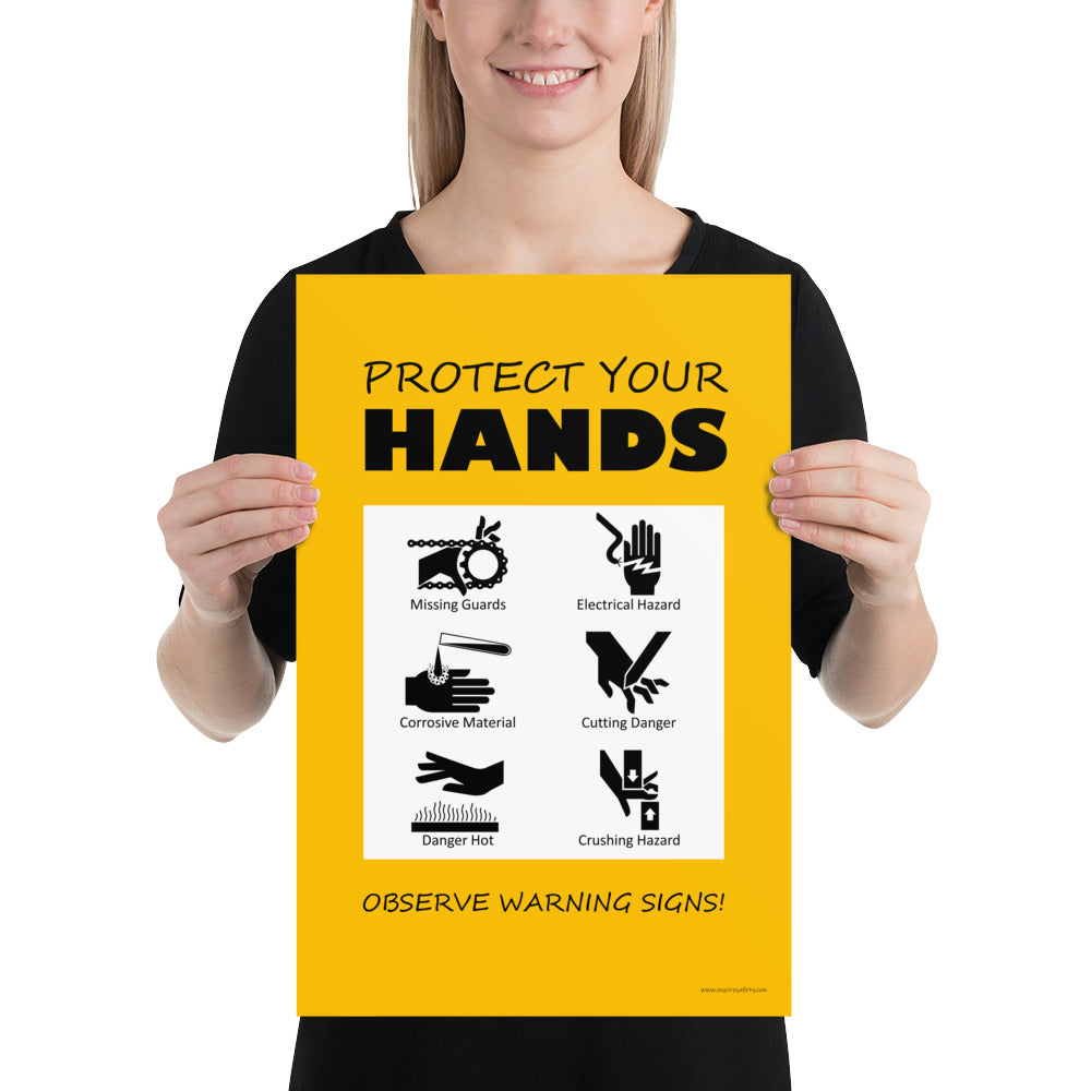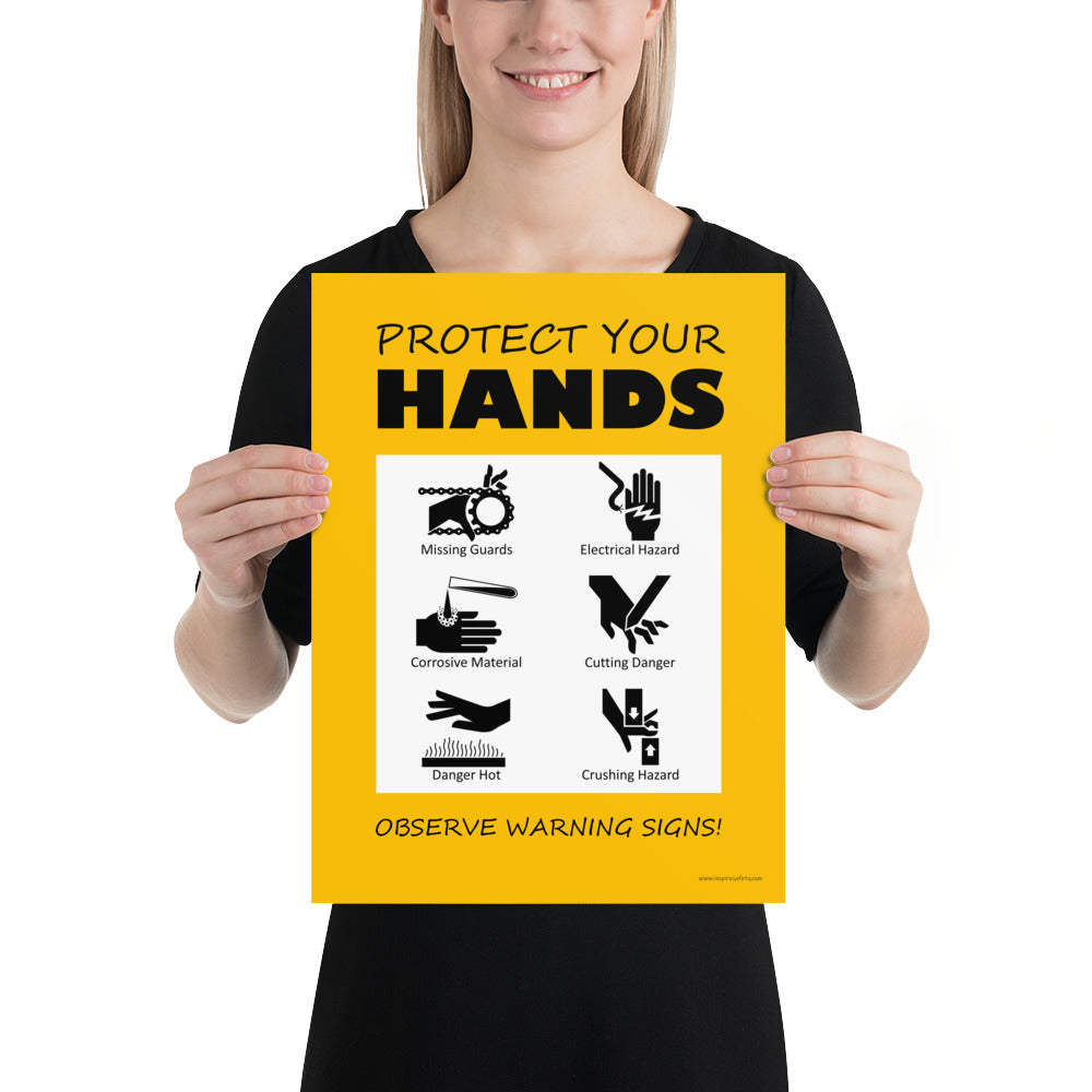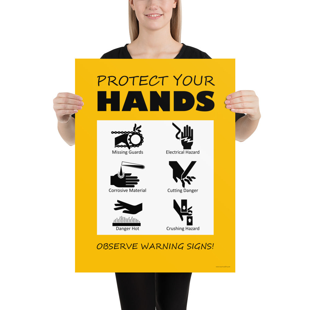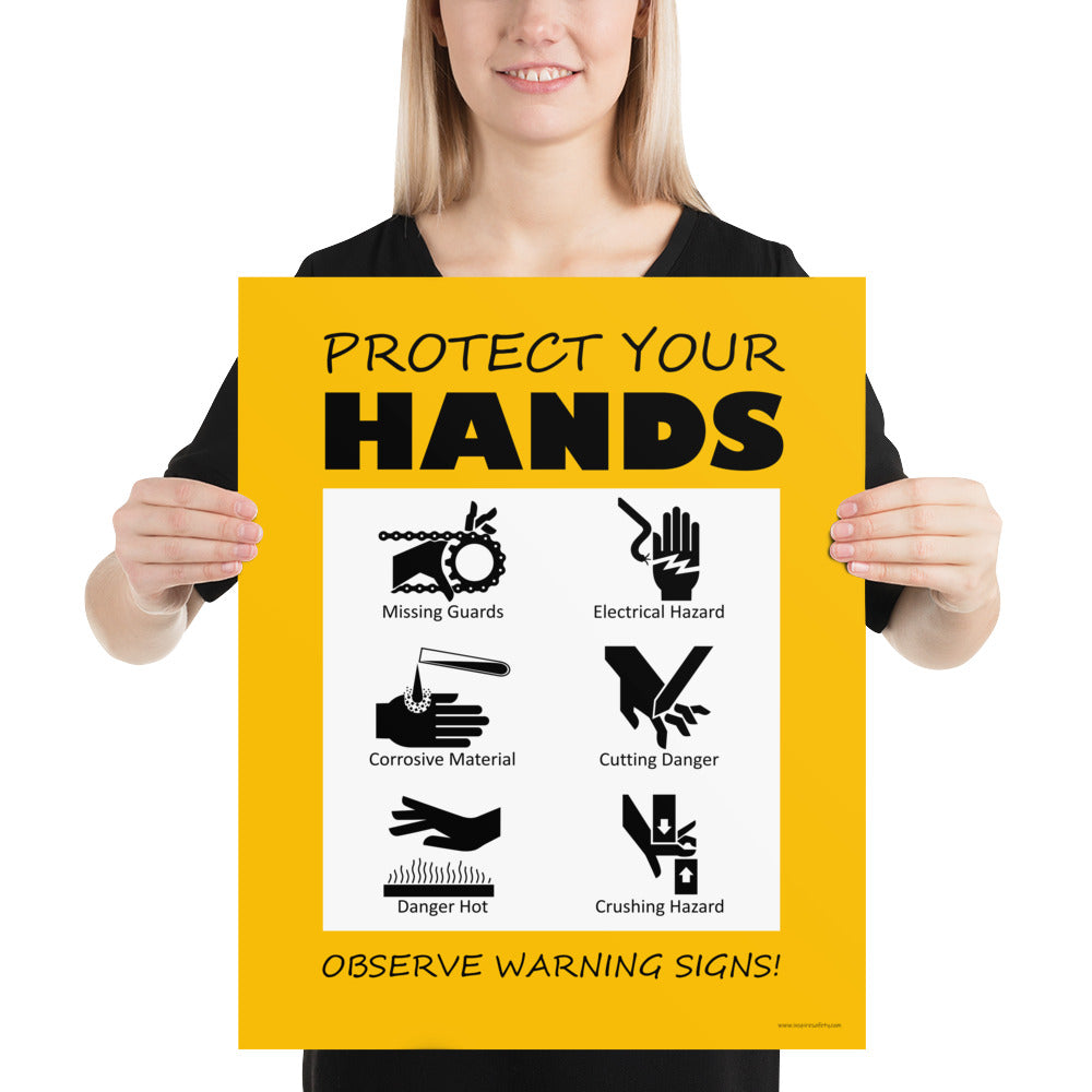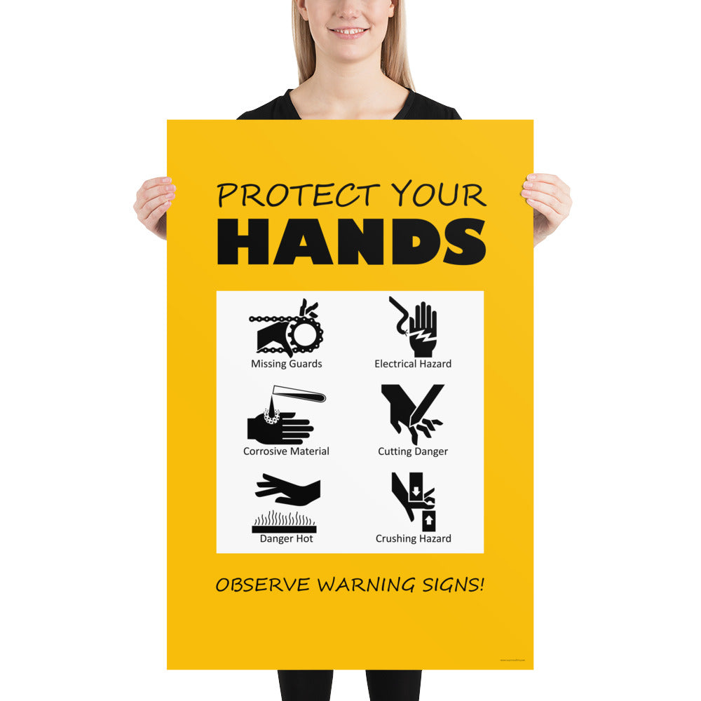 This workplace safety poster, presented in striking yellow with bold black text, serves as a stark reminder: "Protect your hands, observe warning signs". Accompanied by six impactful diagrams illustrating potential hand injuries, it's a powerful tool designed to foster a conscious safety culture.