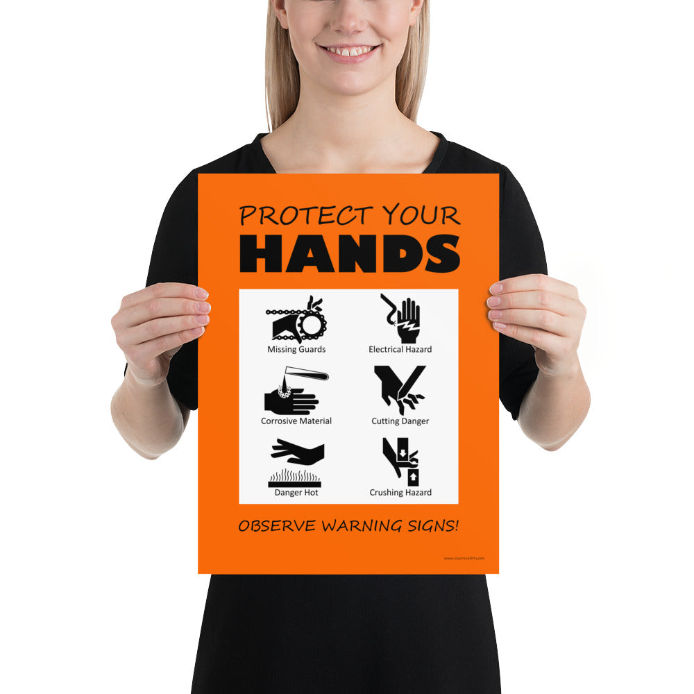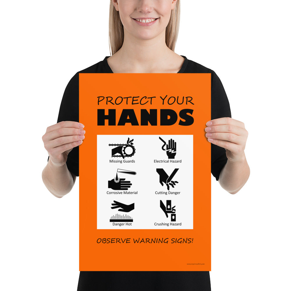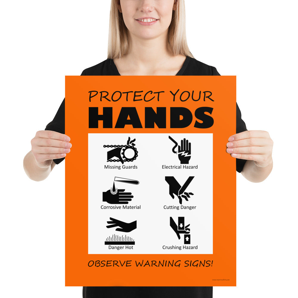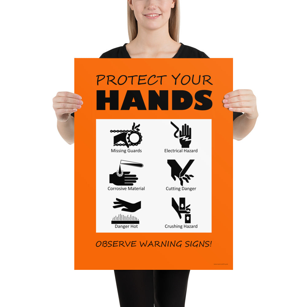 This workplace safety poster, presented in striking orange with bold black text, serves as a stark reminder: "Protect your hands, observe warning signs". Accompanied by six impactful diagrams illustrating potential hand injuries, it's a powerful tool designed to foster a conscious safety culture.