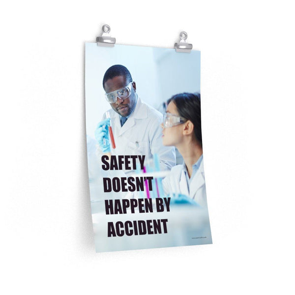 Illuminate the walls of your laboratory with our inspirational lab safety poster. Elegantly designed, it features diligent male and female scientists, cloaked in crisp lab coats and safety glasses, meticulously inspecting a test tube. The bold, unmissable slogan "Safety doesn't happen by accident" serves as a daily reminder to uphold the highest safety standards in every experimental endeavor.