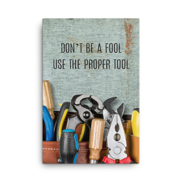 The "Don't be a fool, use the proper tool" poster is not merely a humorous piece; it's a crucial reminder in any workplace that values safety and diligence. By showcasing an array of tools carefully placed on a classic wooden table, this poster subtly yet firmly communicates the paramount importance of utilizing the right equipment for every task in the workplace.