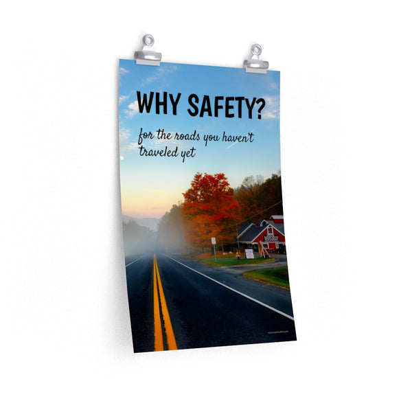 This workplace safety poster beautifully captures a serene tourist restaurant by the side of a road amidst the splendor of autumn. With trees shifting colors and a mystical fog enveloping the scene, it poses the question through its slogan, "Why Safety? for the roads you haven't traveled yet."