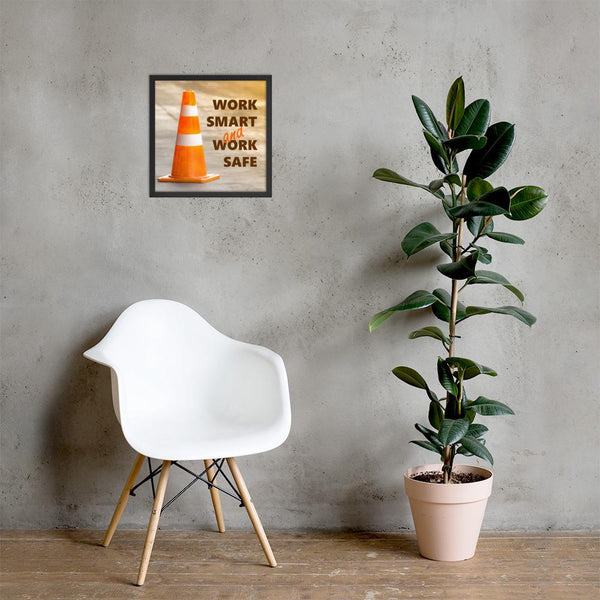 Discover a safety poster featuring a vivid close-up of an orange traffic cone, accompanied by the compelling slogan "Work Smart and Work Safe."