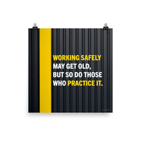 Ensure the message of workplace safety rings loud and clear with our impactful construction safety poster. Featuring a sturdy black metal wall adorned with a vivid yellow stripe, this poster elegantly emphasizes the invaluable message, "Working safely may get old, but so do those who practice it."
